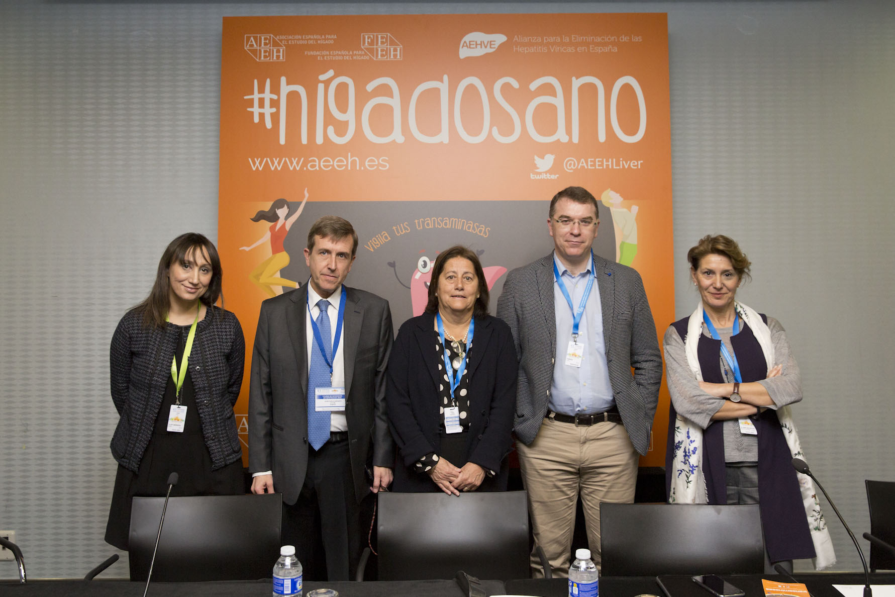 PIE DE FOTO. De izquierda a derecha, en la zona central de la imagen: Elba Llop, vocal de la AEEH (Asociación Española para el Estudio del Hígado); Javier García-Samaniego, coordinador de AEHVE (Alianza para la Eliminación de las Hepatitis Víricas); María Buti, presidenta de la AEEH; Juan Turnes, secretario de AEEH y responsable de la campaña #HígadoSano; y Carmen Navascués, vocal de la AEEH.