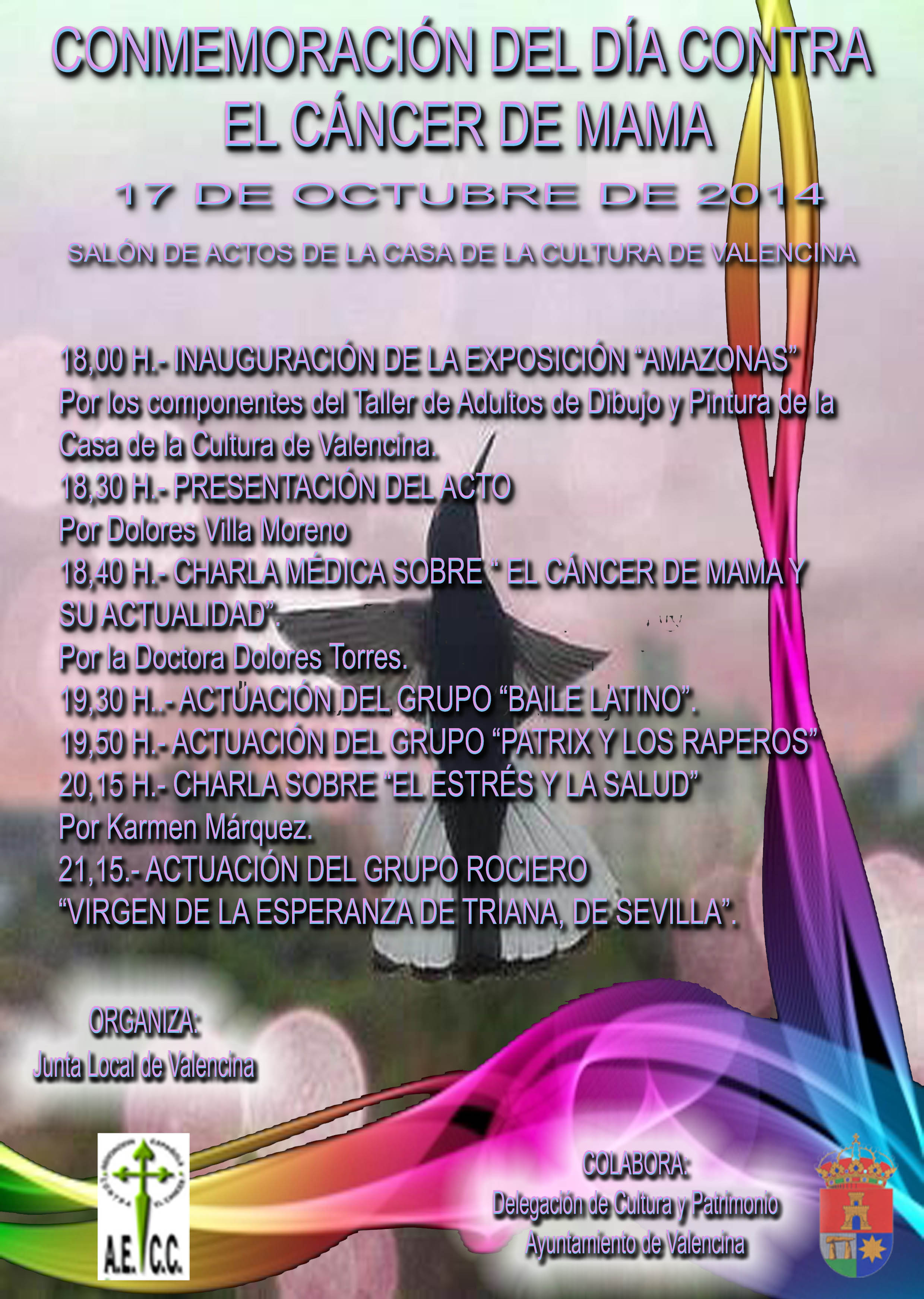 Valencina, 16 de octubre de 2014.- El Ayuntamiento de Valencina, a través de la Delegación de Cultura y Patrimonio, conmemora el viernes 17 de octubre el Día Contra el Cáncer de mama en colaboración la Asociación Española contra el Cáncer (AECC). La jornada, que celebra el Consistorio valencinero hace varios años, contempla dos charlas médicas, actuaciones musicales y por primera vez incorpora una exposición, que inaugura el alcalde, Antonio Suárez. Bajo el título “Amazonas”, la muestra reúne 38 obras realizadas por miembros del Taller de Adultos de dibujo y pintura de Valencina.